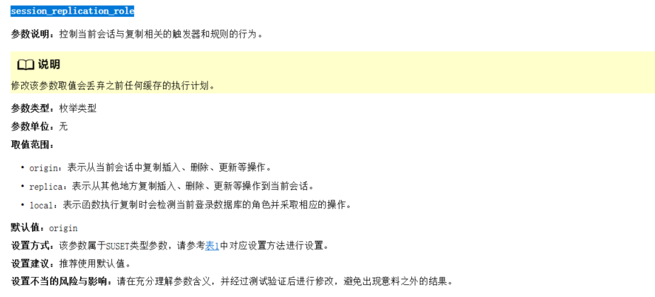 session_replication_role 是 PostgreSQL/GaussDB 的一个会话级参数,用于控制触发器和规则的行为
